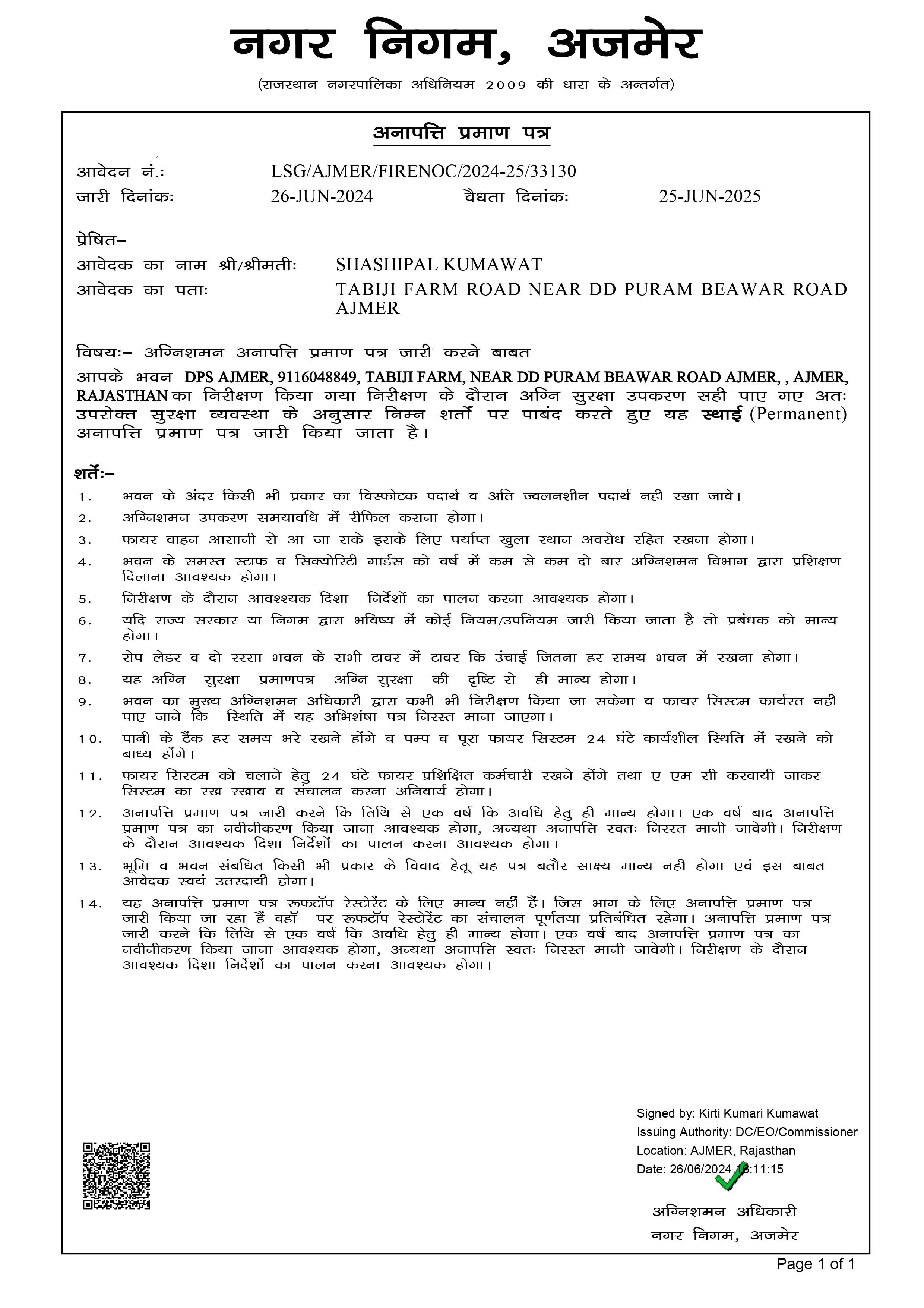 - COPY OF VALID FIRE SAFETY CERTIFICATE ISSUED BY THE COMPETENT AUTHORITY :